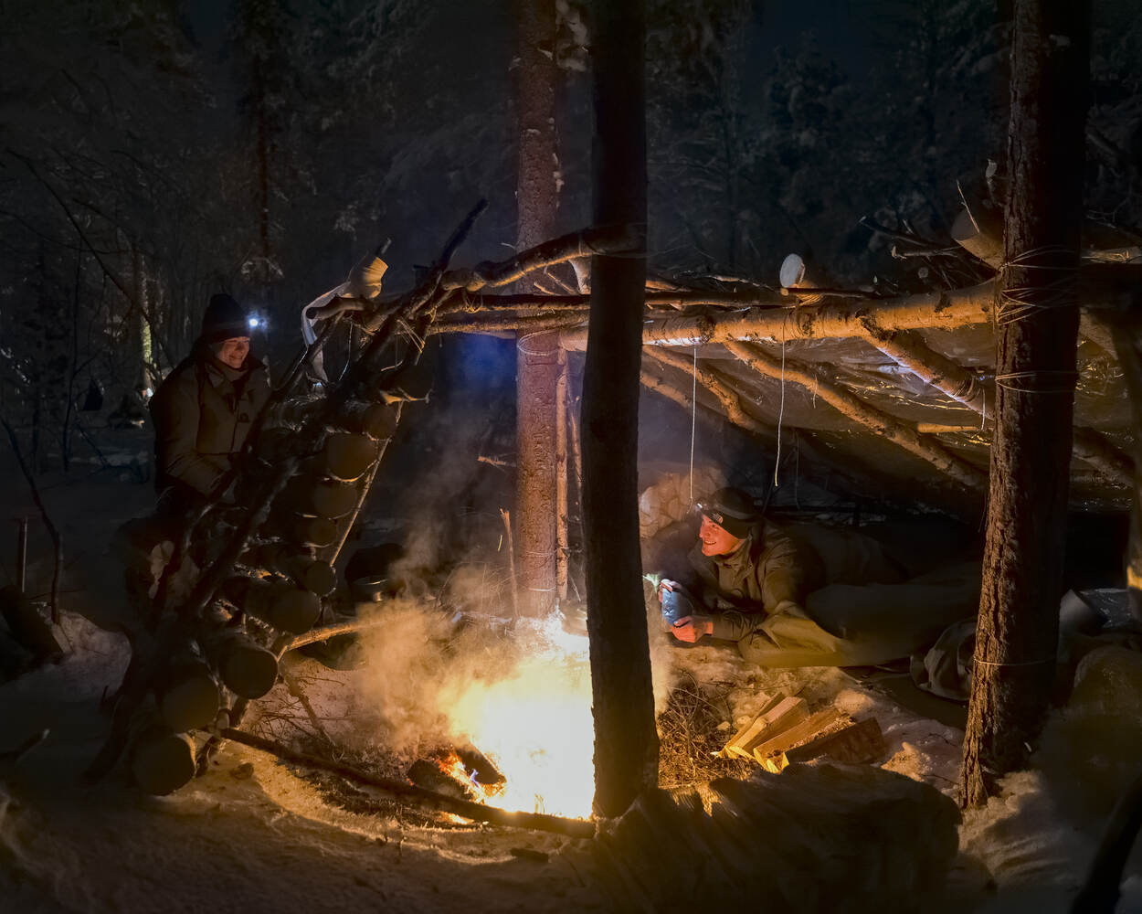 Een overnachting in de buitenlucht kan tijdens de cursus uiteraard niet ontbreken. Na een verplaatsing door de sneeuw moeten de collega’s zelf hun onderkomen bouwen en inrichten. Bomen worden handmatig omgezaagd en gebruikt om de perfecte shelter te bouwen, die de invloeden van weer en wind zoveel mogelijk beperkt.
