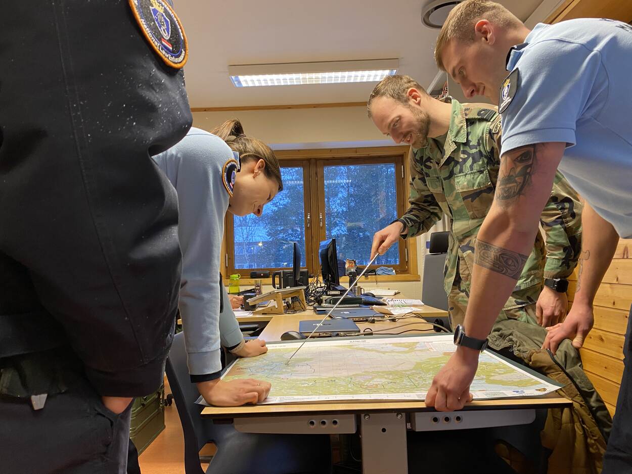Tijdens een overleg toont een kapitein der mariniers op een kaart van het trainingsgebied aan de KMar-collega’s waar zijn eenheden zich in het veld bevinden en waar buitenlandse collega’s aan het trainen zijn.