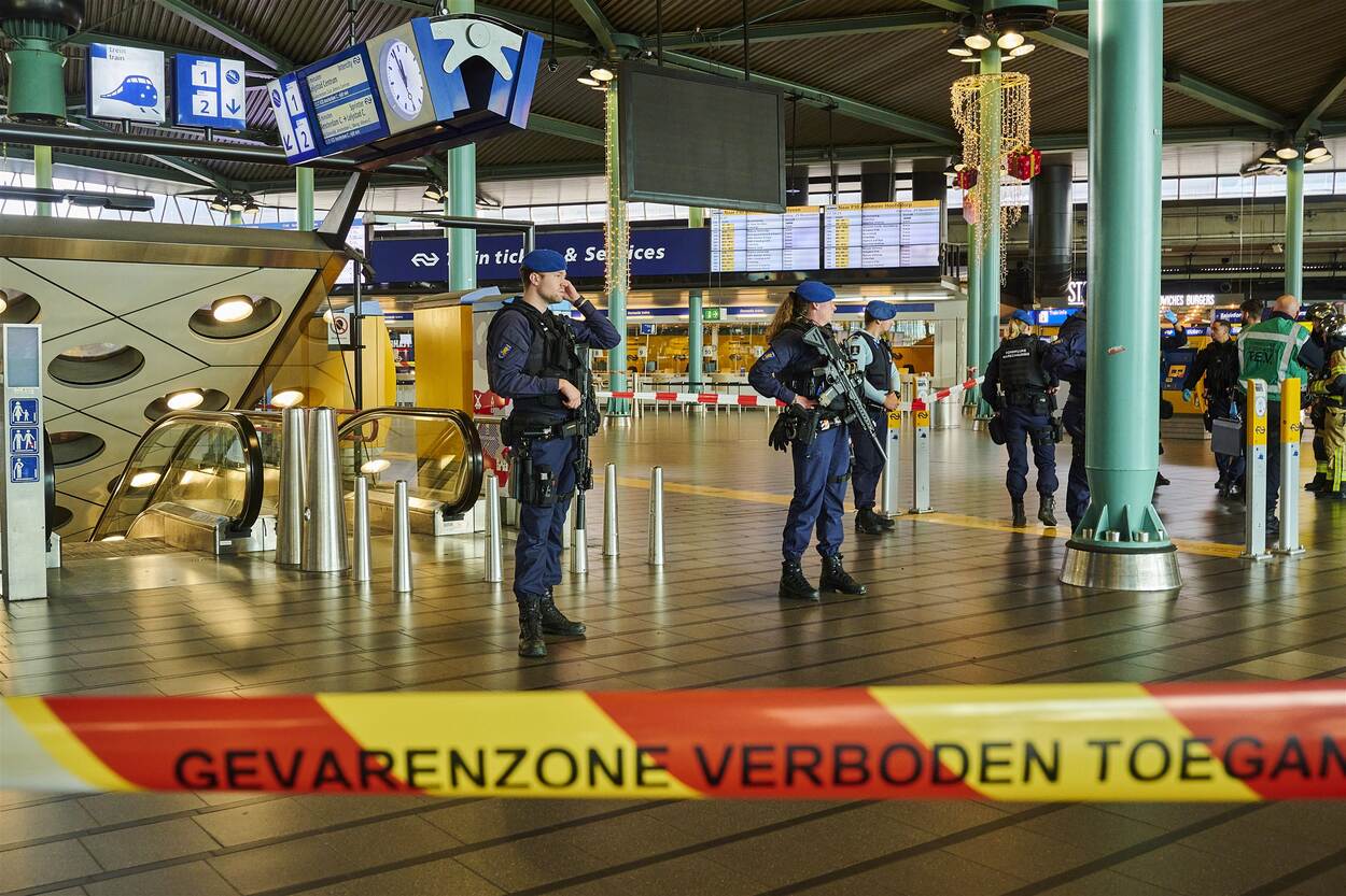 Urenlang wordt een deel van Schiphol Plaza afgezet. Een koppel van het CBRNE-team komt de koffer en de inhoud onderzoeken. Foto: ANP