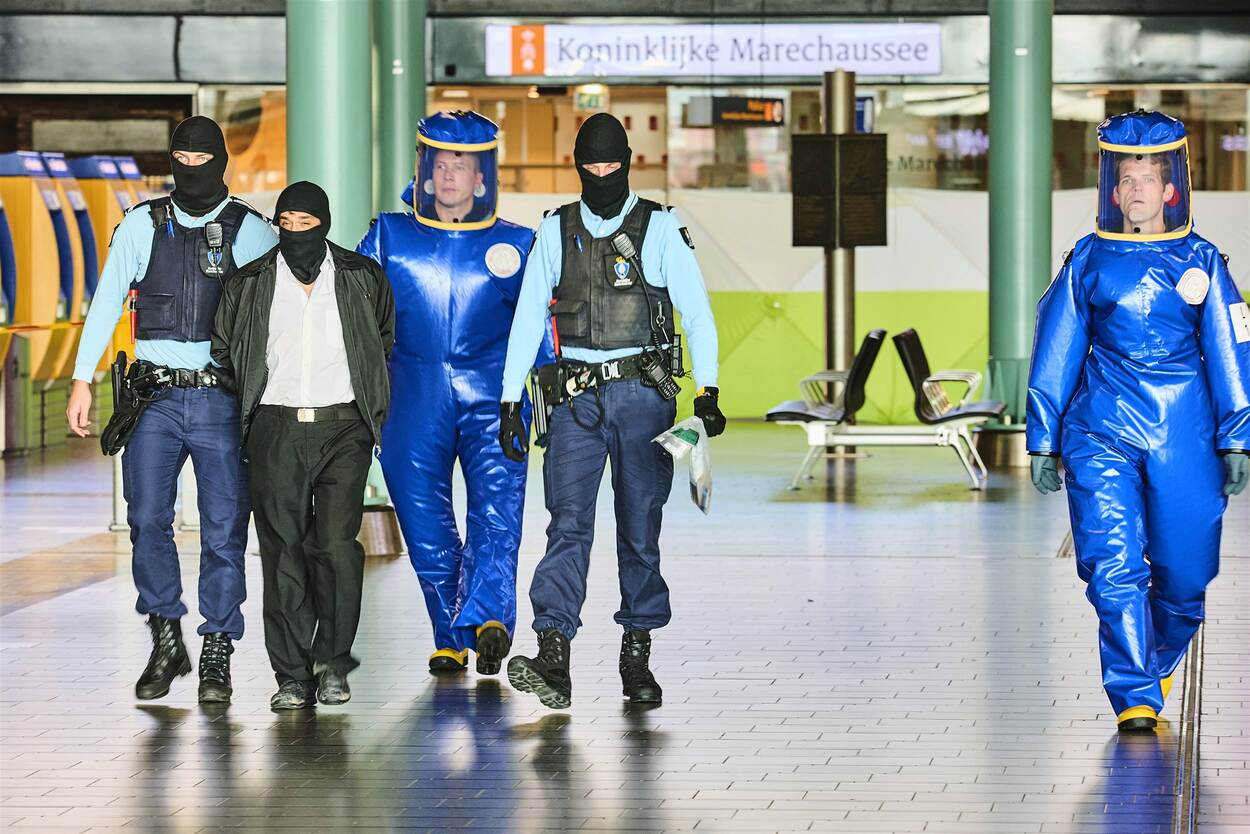 De verdachte wordt door de Marechaussee aangehouden voor dreiging met een terroristisch motief. Hij was die ochtend gearriveerd met een vlucht uit het buitenland. Foto: ANP