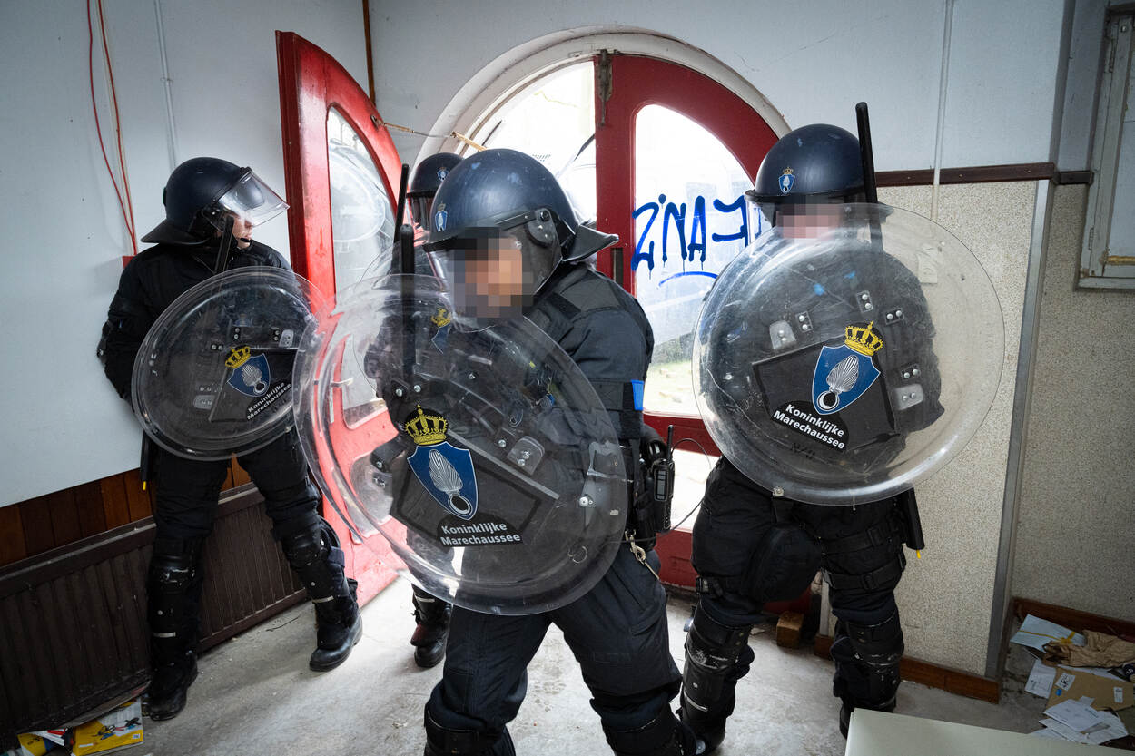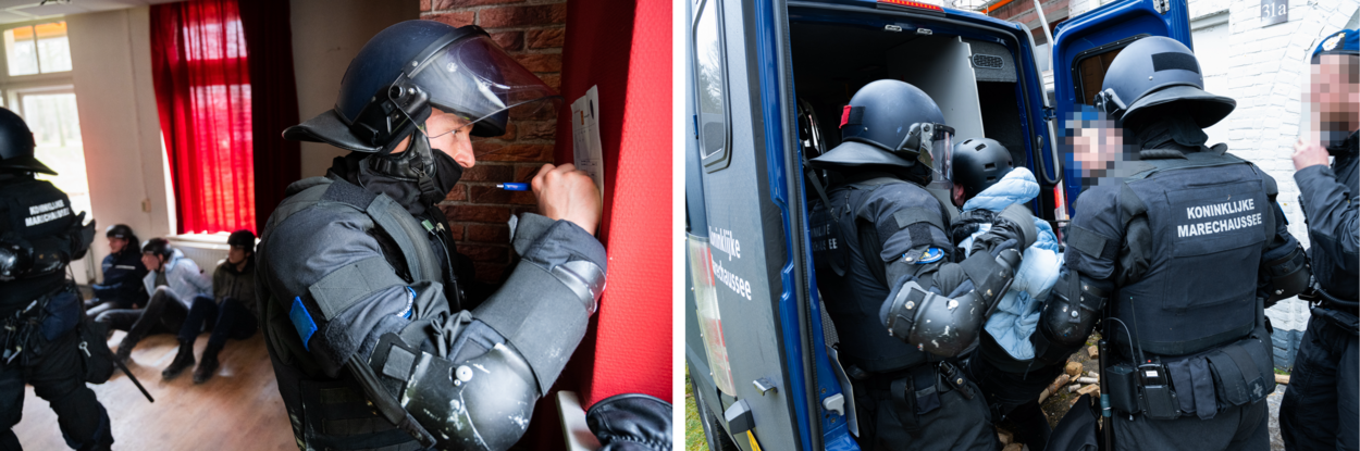 De oefening begon met de bevelsuitgifte op de Oranjekazerne, waarna het peloton Mobiele Eenheid (ME) op pad ging. Het eerste scenario speelde zich af in een verpauperd kraakpand, dat bezet werd door dakloze asielzoekers en sympathisanten. De krakers waren meerdere keren gewaarschuwd om het pand te verlaten, maar tevergeefs. Dus de ME mocht tot ontruiming overgaan. “Hier spreekt de Marechaussee. U bent allen aangehouden!”, schalde het vanuit de megafoon. Hierna blokkeerden ze de ingang van het pand strategisch met hun bussen, waardoor niemand het gebouw meer kon verlaten. Vervolgens veegden de ME’ers de verdiepingen één voor één schoon en hielden ze de demonstranten aan. “En nu is het klaar!”, beet een marechaussee een opstandige demonstrant toe.