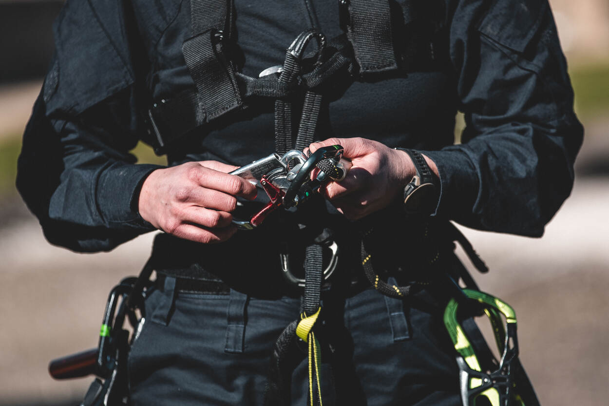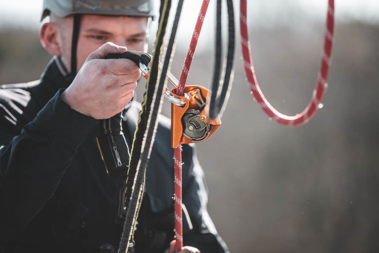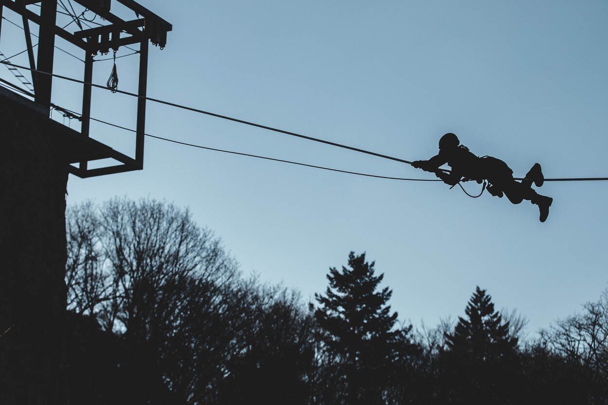 “Niet denken: wat als? Maar: wat moet ik doen?” In de woorden van de instructeur klinkt het eenvoudig, tot je eenmaal in de touwen hangt en op je buik voorwaarts schuift.