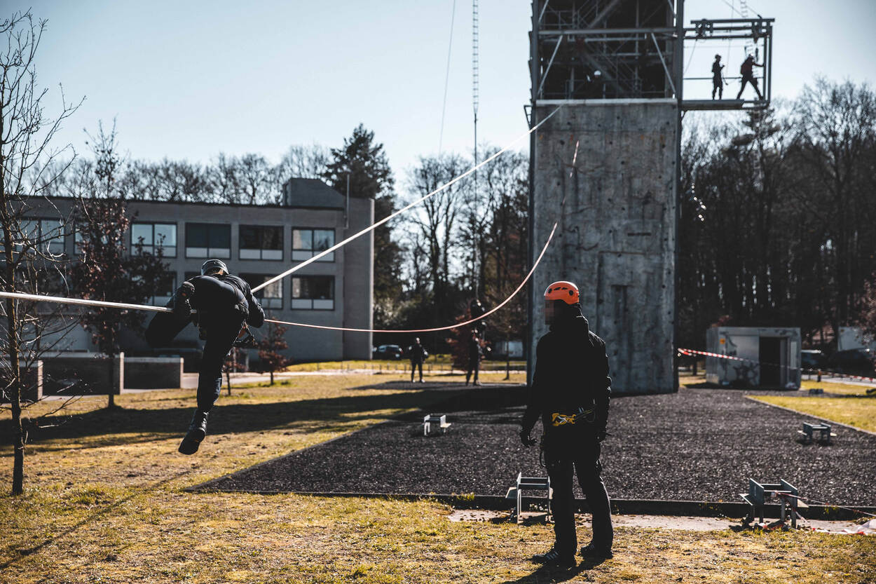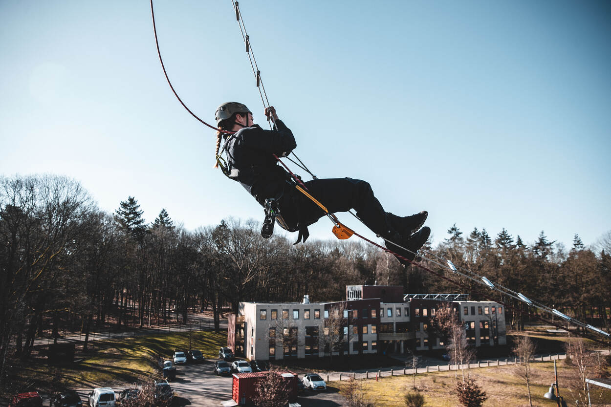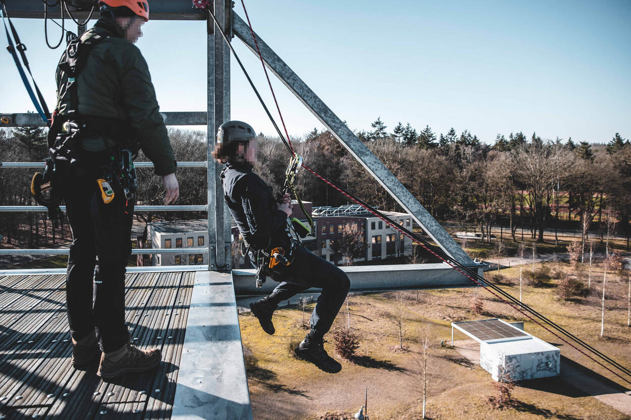 Aan het einde wacht hen een beloning: de tyrolienne. “Waarbij de toekomstige BSB’ers aan een zipline op 20 meter de diepte inspringen. Een genietmoment”, aldus adjudant Wouter.