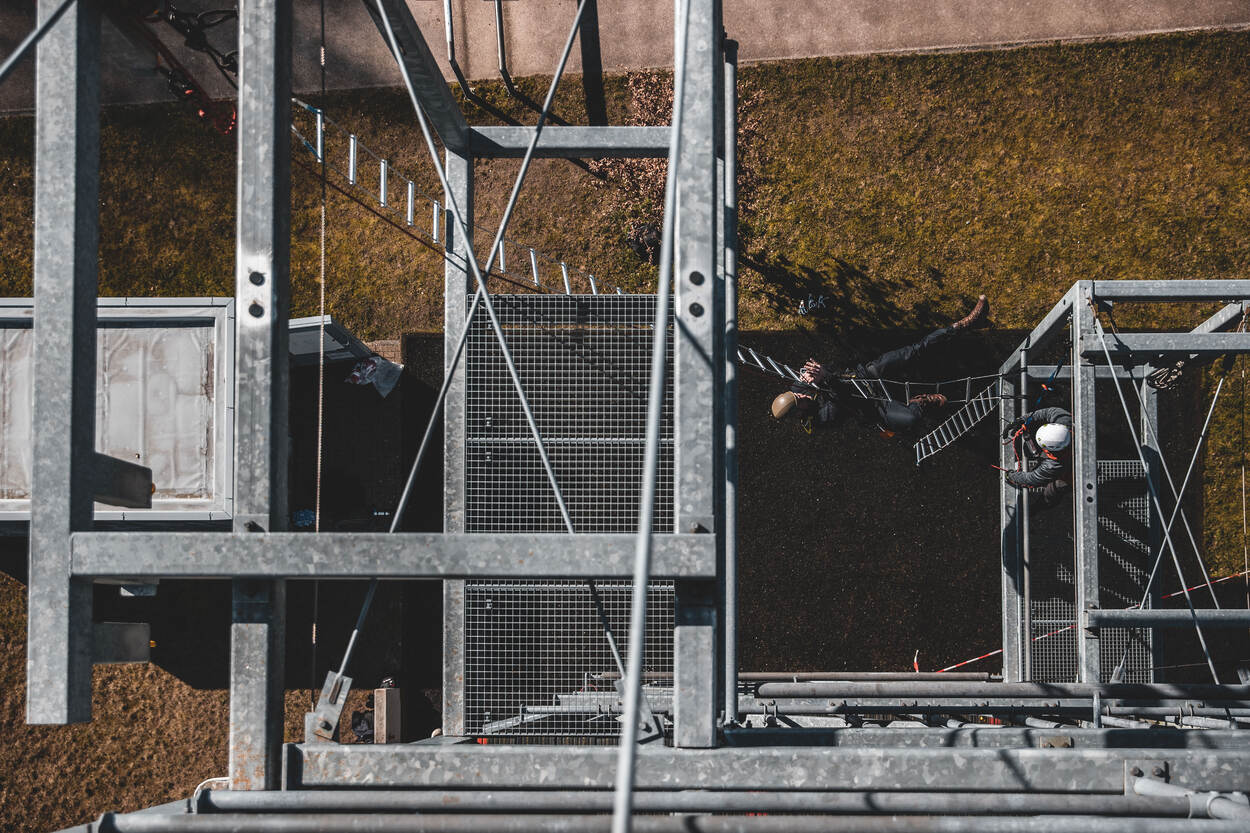 De toren kent nog een trap. Op een hoogte van 10 meter klimmen de BSB’ers naar een hoogte van 15 meter, hangend aan de armen.
