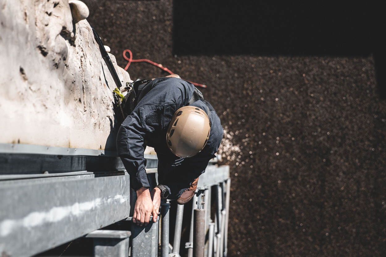 “Die hoogte zit ik niet mee. Het is vooral fysiek pittig. We hebben al een behoorlijk programma achter de rug. Je begint nu te merken dat je lijf op begint te raken. Vooral de armen zijn erg verzuurd.”