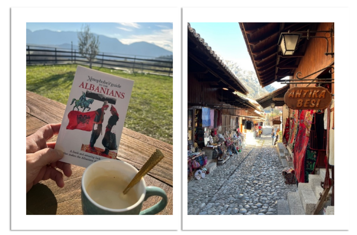 Links: Onder het genot van een kopje koffie in de tuin kennismaken met de gewoontes van Albanië. | Rechts: Een oude bazaar in Krujë.