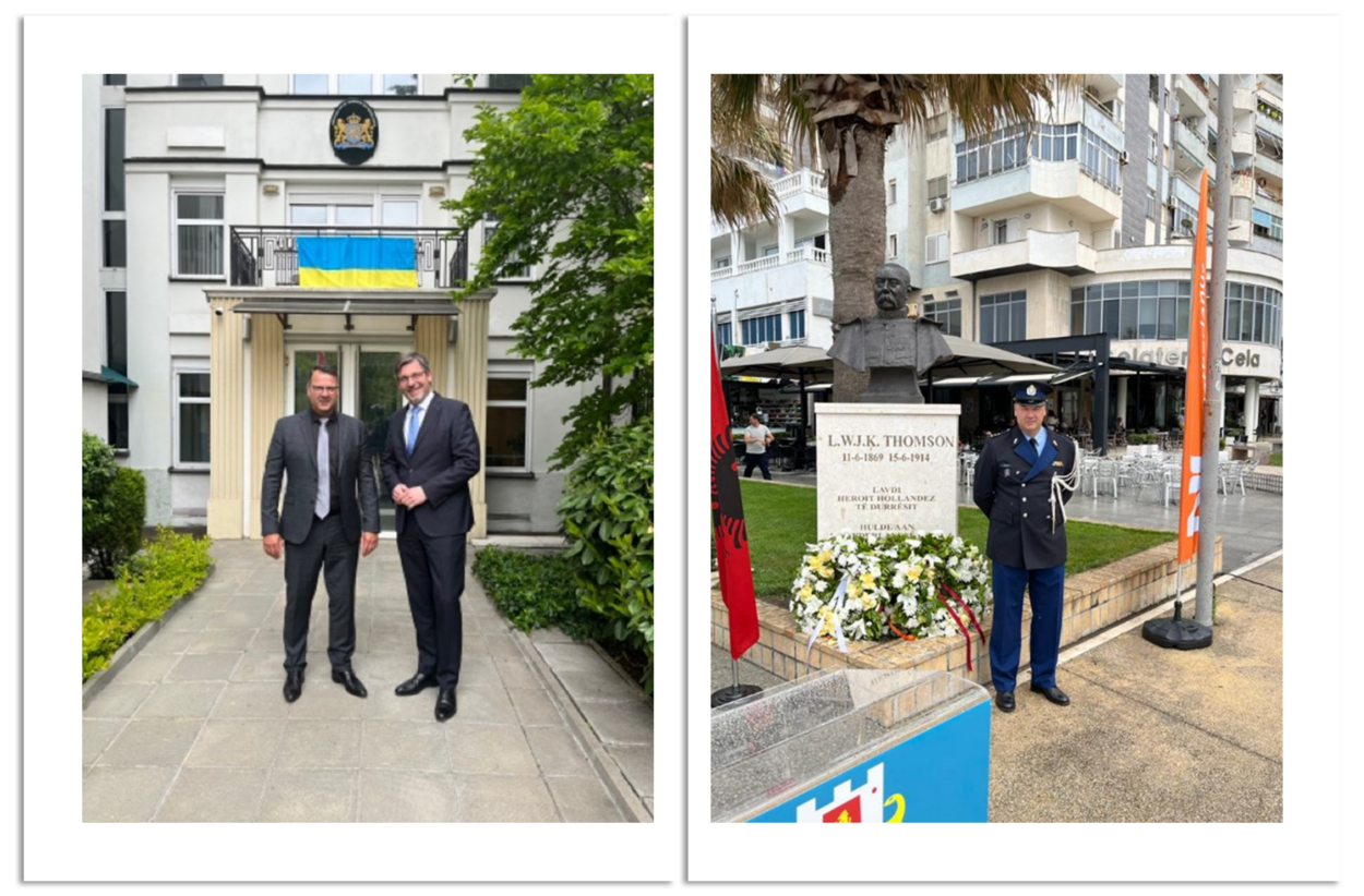 Links: Op bezoek bij de Nederlandse ambassadeur in Bulgarije, Simon van der Burg, met wie ik samen een buitenlandmissie heb mogen uitvoeren in Afghanistan (2012). Rechts: Aanwezig bij de inauguratie van het Kolonel Thomson-monument in Durrës.