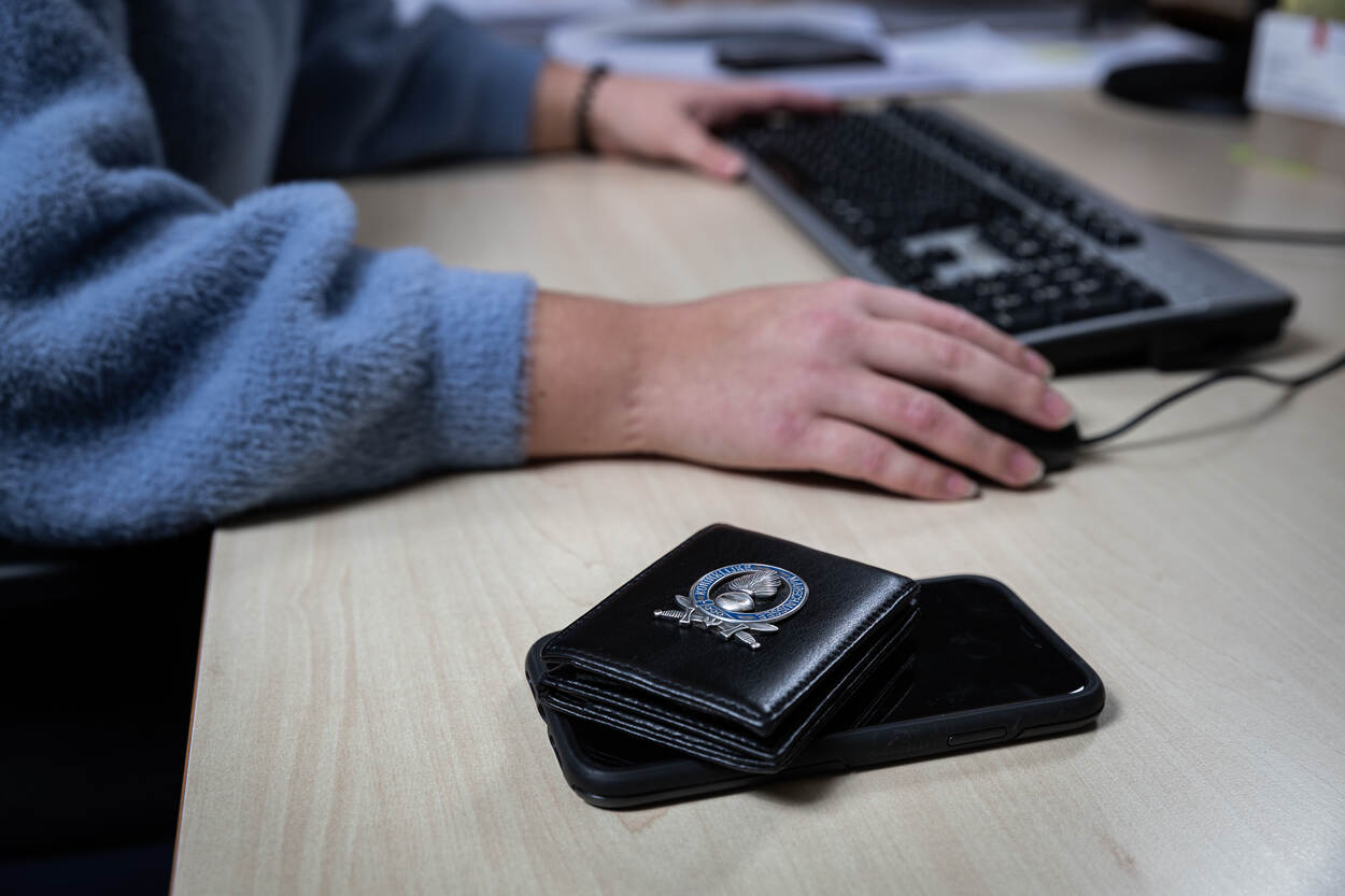Marechausseebadge op de voorgrond. Handen op een toetsenbord op de achtergrond.