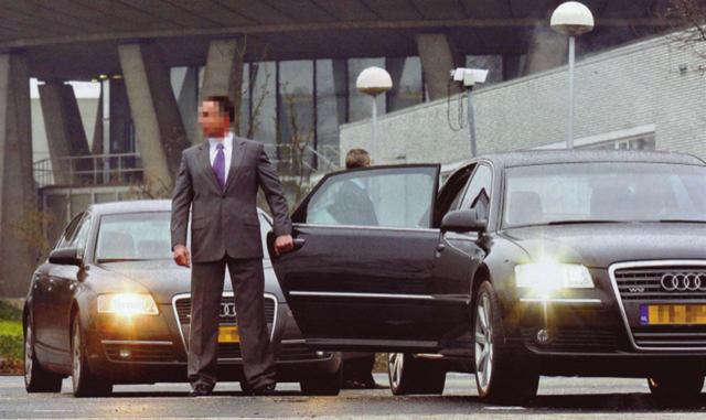 Persoonsbeveiliger in net pak houdt autodeur open en houdt de omgeving in de gaten.