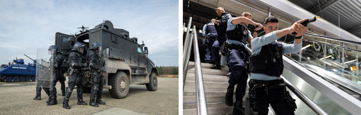 Leden van Landelijke Bijstand Organisatie oefenen in volledige uitrusting met het nieuwe Manticore terreinvoertuig. Foto rechts: Marechaussees lopen tijdens een oefening met getrokken pistool een trap af op zoek naar een verdachte.