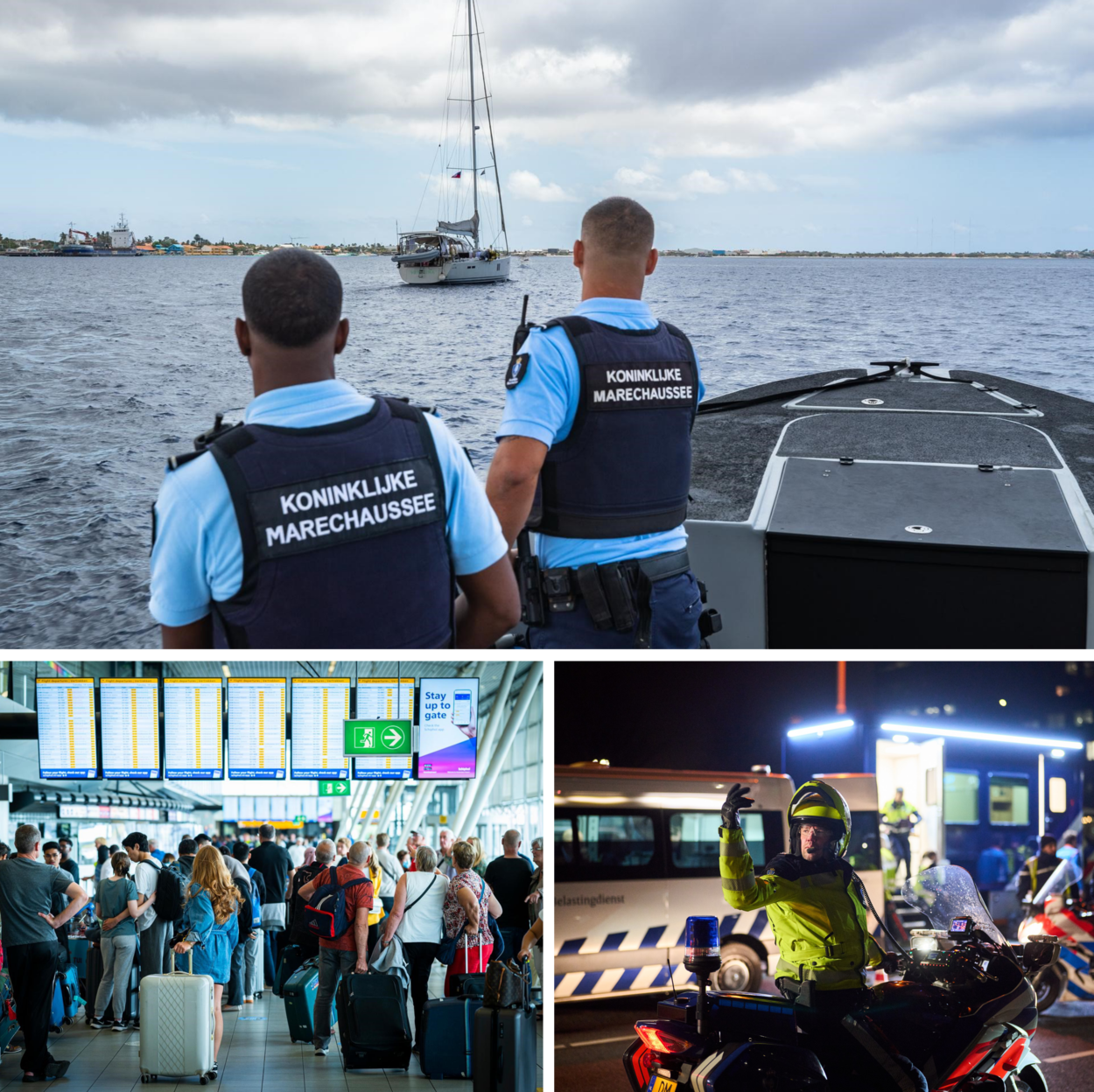 Foto boven: Marechaussees varen naar een boot om die te controleren. Foto linksonder: Reizigers in een drukke vertrekhal op Schiphol. Foto rechtsonder: Motorrijder van de Marechaussee begeleidt een auto tijdens een controle in de avonduren.