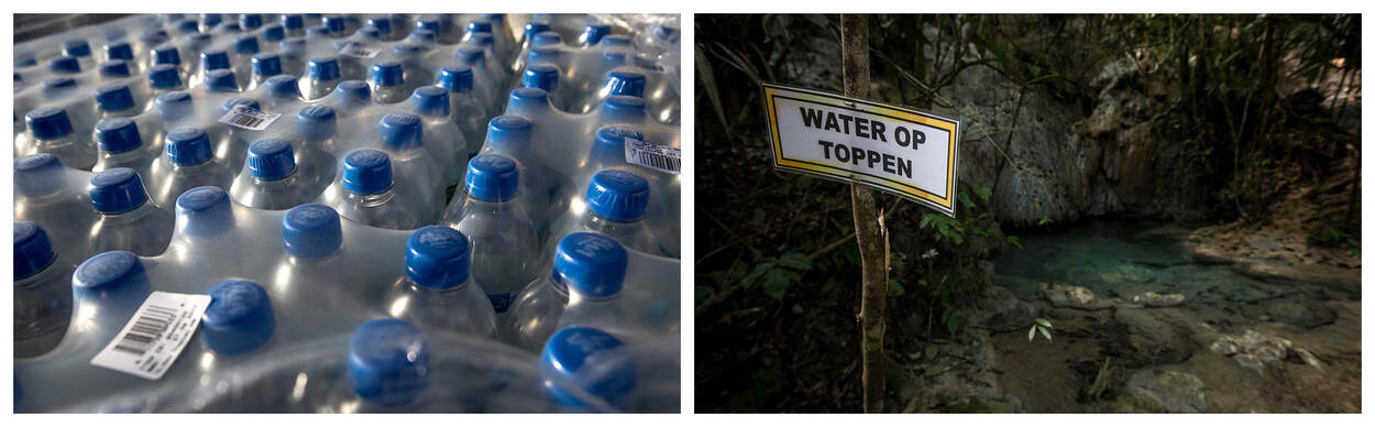 Links een close-up van tientallen flesjes water. Rechts een bordje met de tekst water optoppen als herinnering aan een oefenende eenheid.