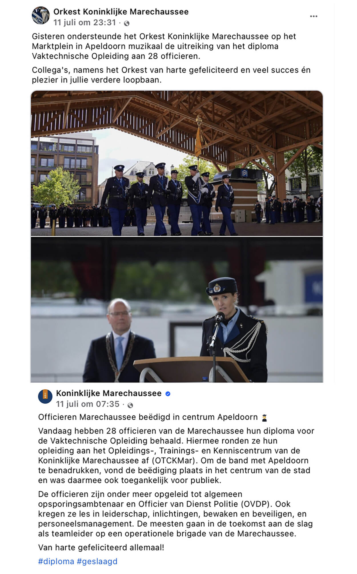 28 officieren van de Marechaussee hebben hun diploma behaald voor de Vaktechnische Opleiding. Hiermee ronden ze hun opleiding aan het Opleidings-, Trainings- en Kenniscentrum van de Koninklijke Marechaussee (OTCKMar) af. Om de band met Apeldoorn te benadrukken, vond de beëdiging plaats in het centrum van de stad en was daarmee ook toegankelijk voor publiek. De officieren zijn onder meer opgeleid tot algemeen opsporingsambtenaar en Officier van Dienst Politie (OVDP).