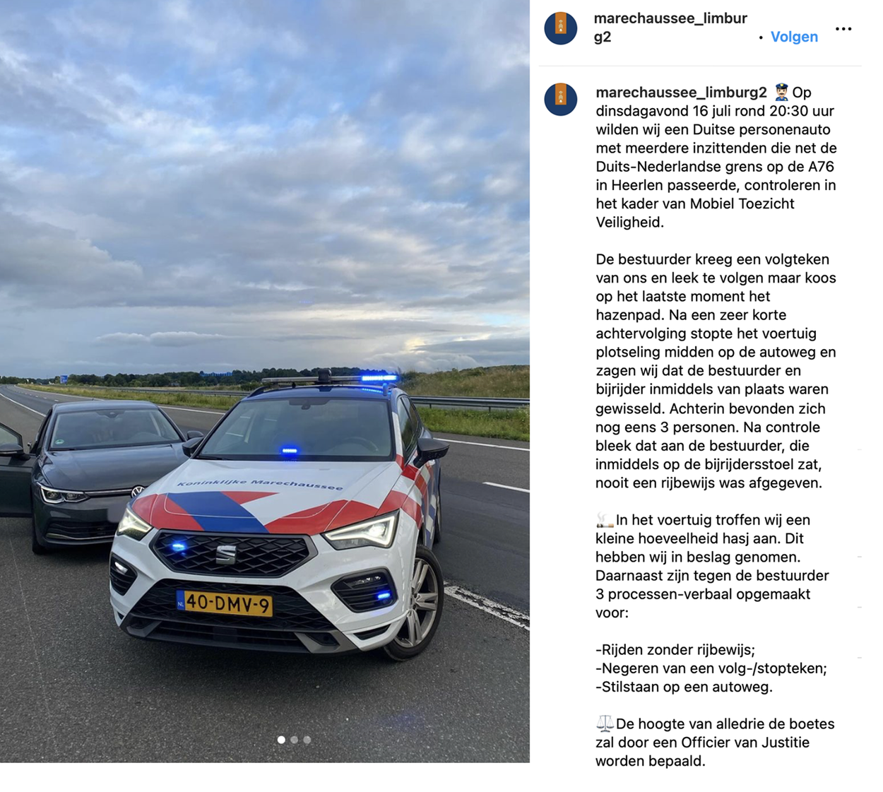 Op dinsdagavond 16 juli rond 20:30 uur wilden wij een Duitse personenauto met meerdere inzittenden die net de Duits-Nederlandse grens op de A76 in Heerlen passeerde, controleren in het kader van Mobiel Toezicht Veiligheid.