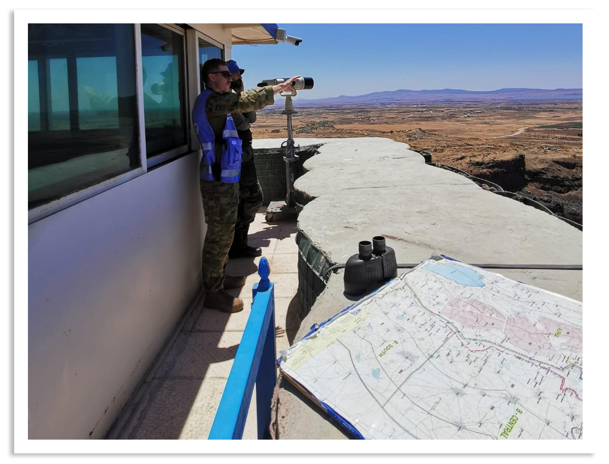Als waarnemer van de VN zie ik toe op het staakt-het-vuren bestand tussen Israël en Syrië, dat sinds 1974 van kracht is. Onze taken bestaan uit statische observaties vanuit een observatiepost, patrouilleren, inspecteren en onderzoek doen wanneer daar door een van de landen om wordt gevraagd.