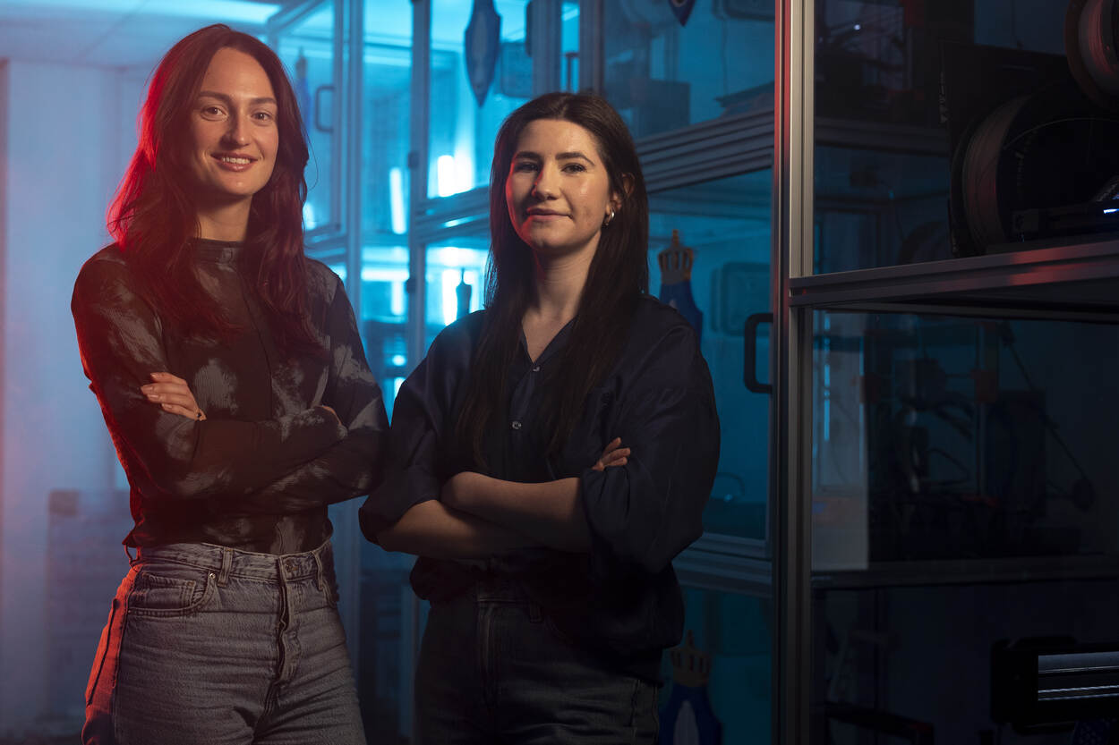 Alice en Sophie voor de kasten met 3D-printers van de sectie DevOps.
