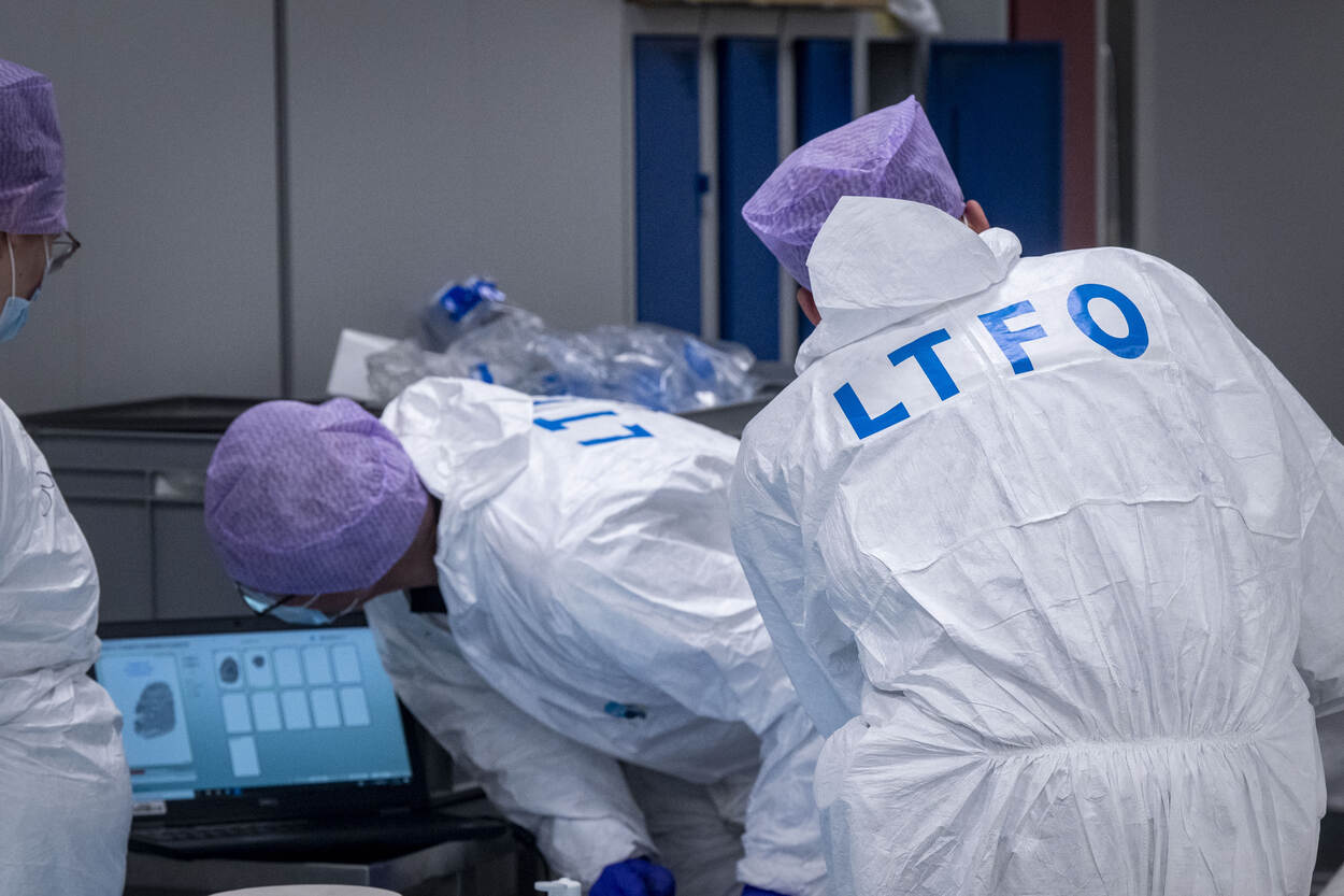 Leden van LTFO werken in witte pakken in het mortuarium en bekijken vingerafdrukken op een computerbeeldscherm.
