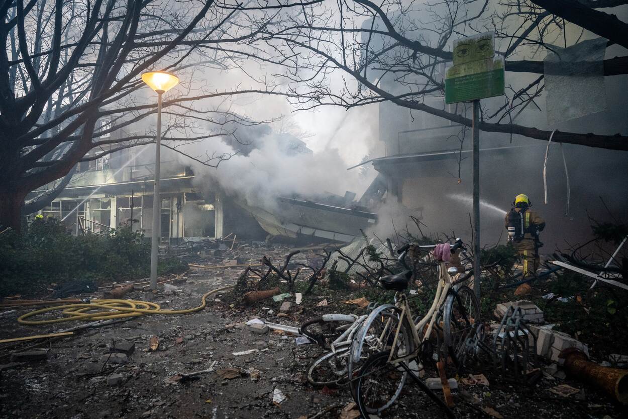 Op de plaats van de explosie wordt ’s ochtends brand geblust.