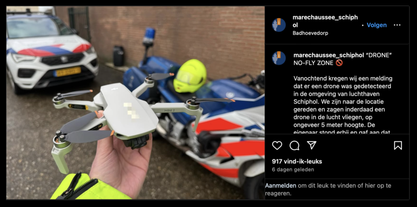 "Vanochtend kregen wij een melding dat er een drone was gedetecteerd in de omgeving van luchthaven Schiphol. We zijn naar de locatie gereden en zagen inderdaad een drone in de lucht vliegen, op ongeveer 5 meter hoogte. De eigenaar stond erbij en gaf aan dat hij zijn drone aan het uittesten was vanwege de aankomende vakantie.
