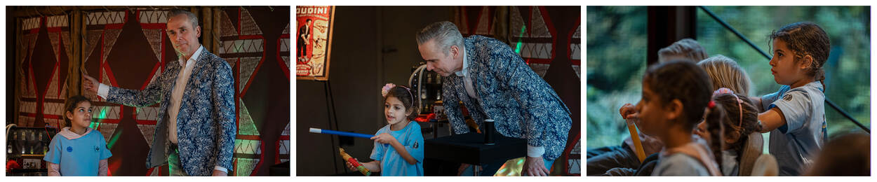 Goochelaar Jan laat trucjes aan de kinderen zien.