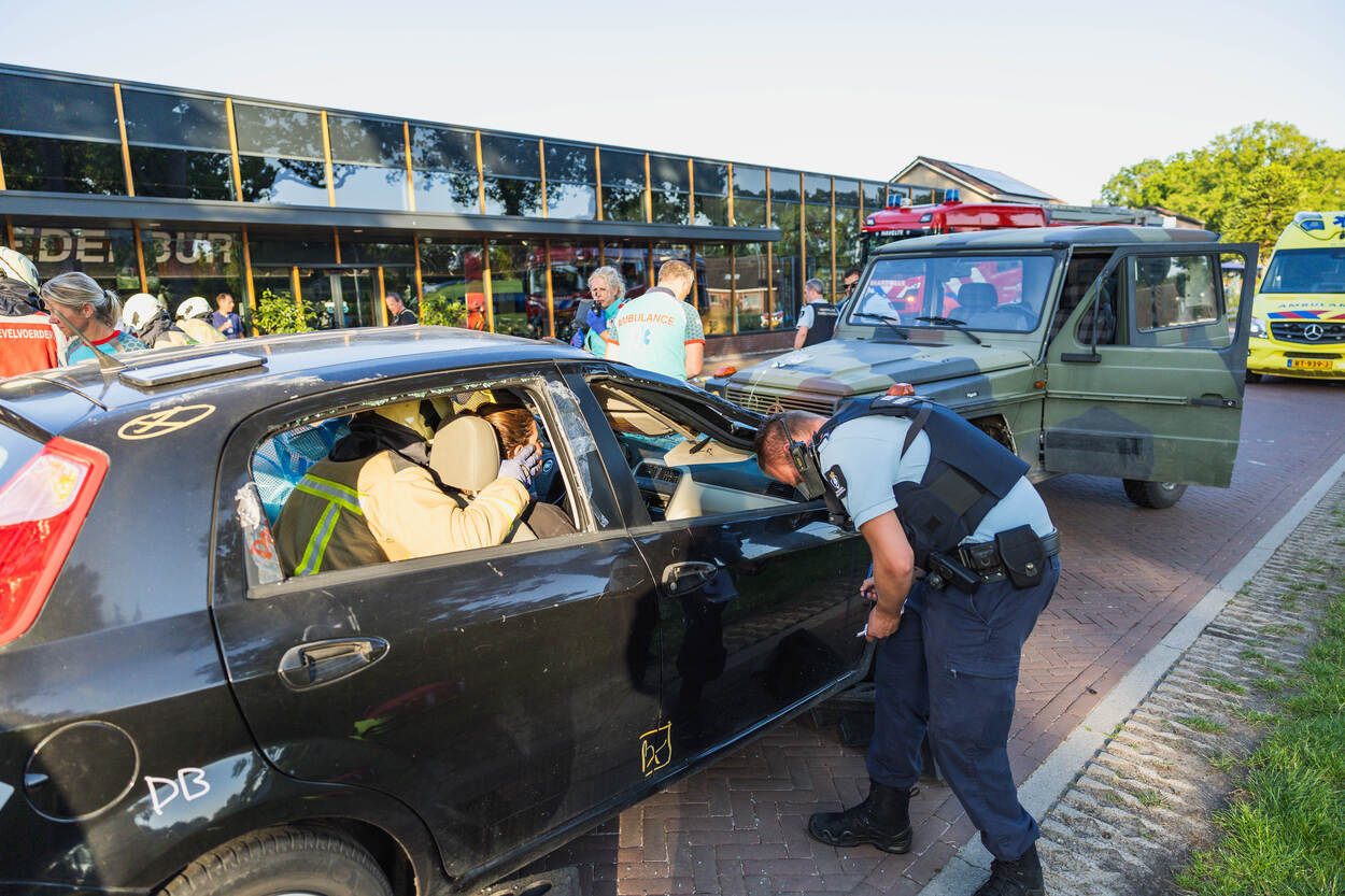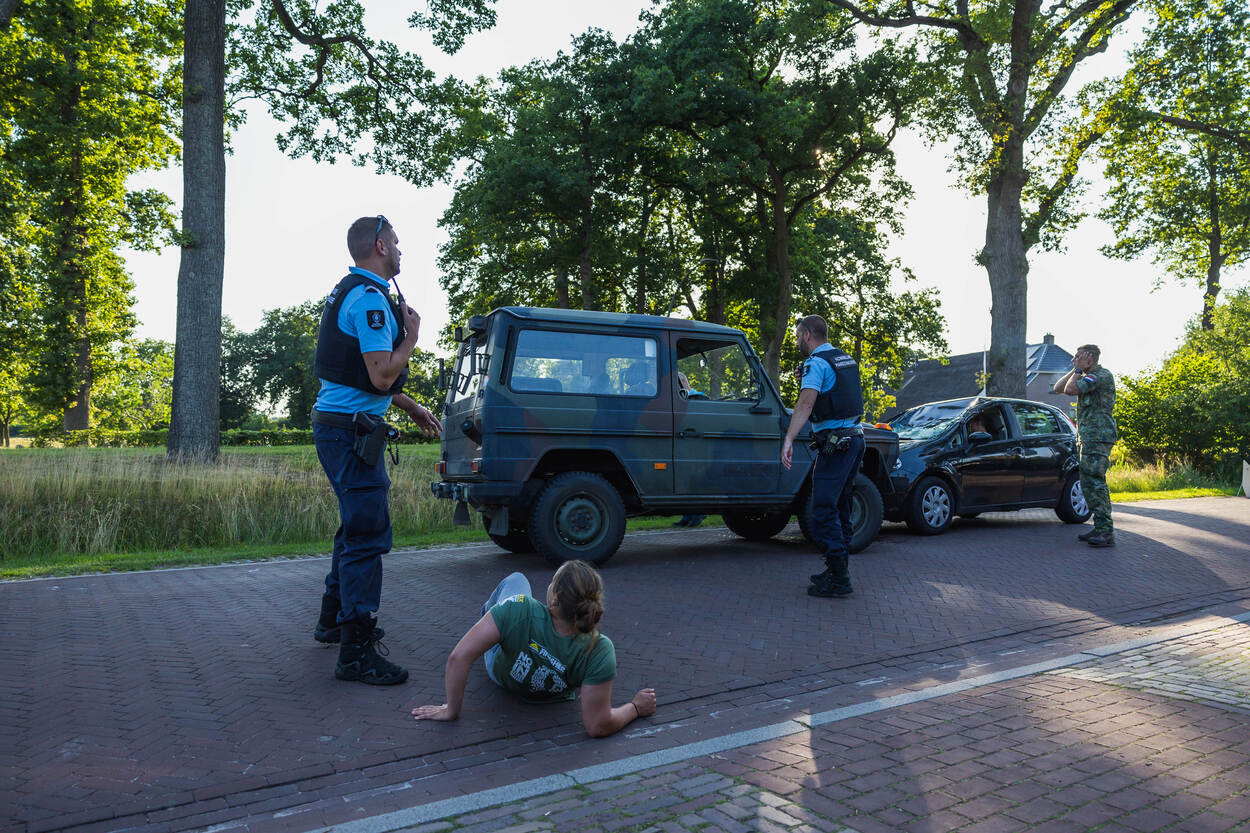 Twee marechaussees staan bij wagens die frontaal op elkaar zijn gebotst. Links een militaire terreinwagen, rechts een zwarte personenauto. Op de grond ligt een gewonde voetganger die zonder te kijken de weg overstak.