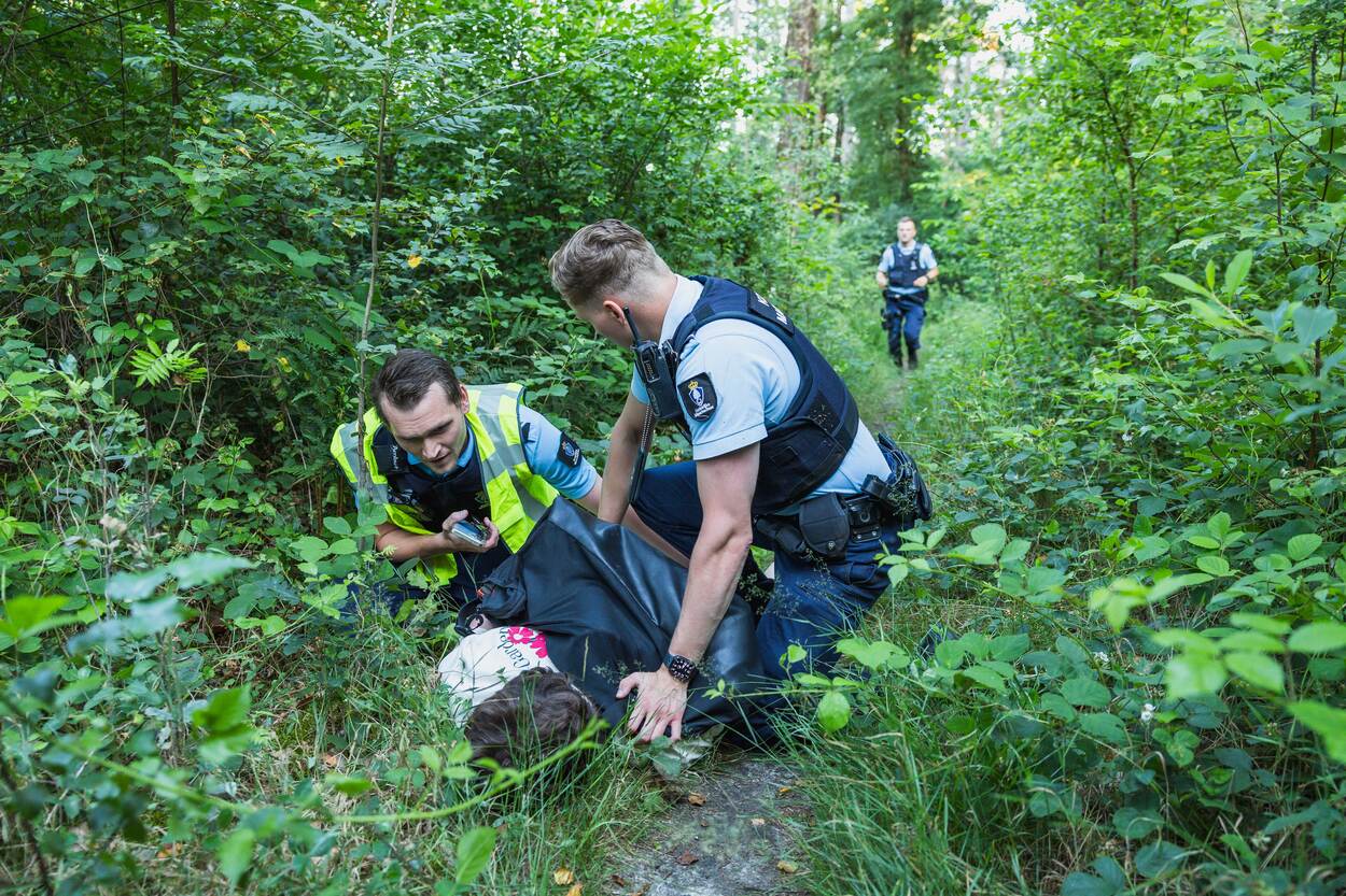 Twee marechaussees houden in de bosjes een verdachte in bedwang, terwijl er versteking aan komt rennen.