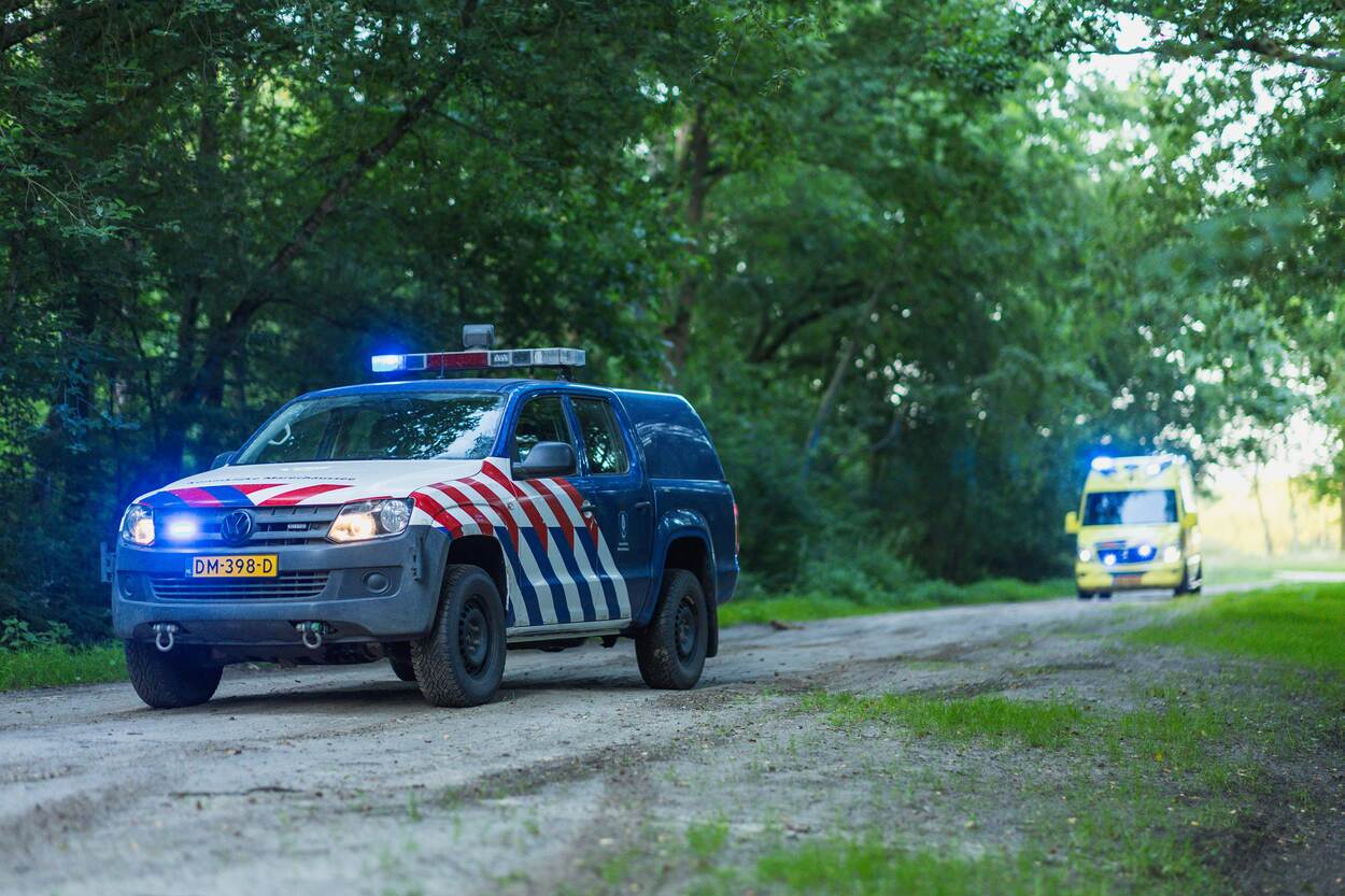 Een Marechausseevoertuig met rood-wit-blauwe striping rijdt met zwaailichten over een bospad. Erachter een ambulance ook met zwaailichten aan.