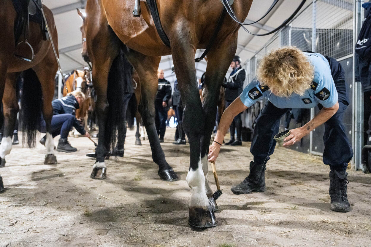 Marechaussees vetten de hoeven van paarden op Renbaan Duindigt.