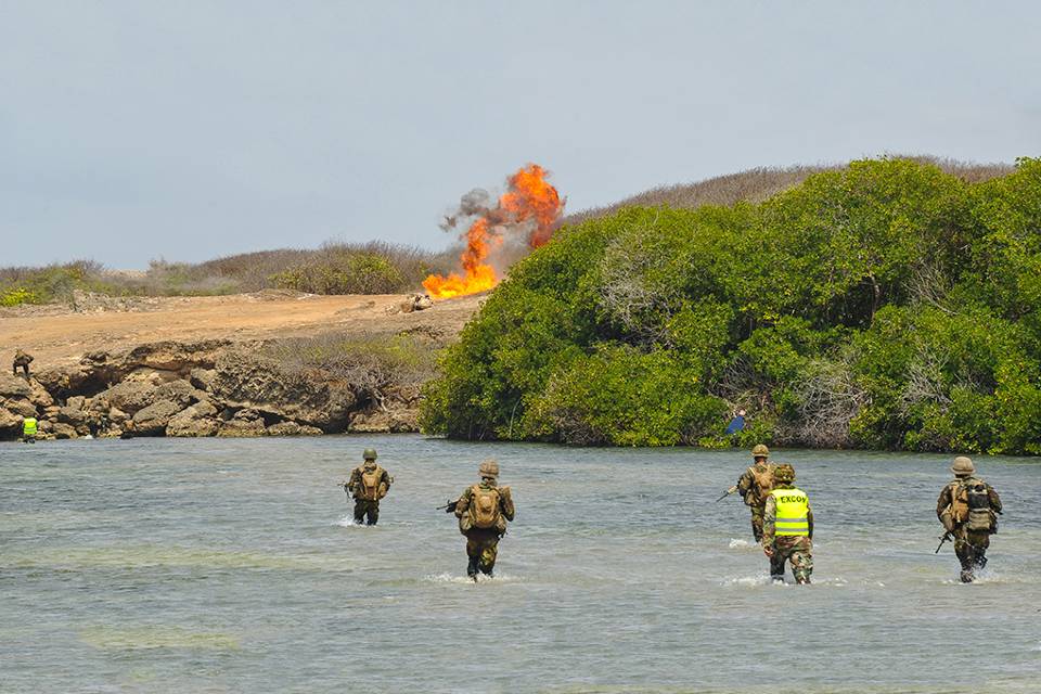 “Deze life firing tactical training is de spannendste die ik ooit heb gedaan”, vertelt één van de soldaten. “Het is loodzwaar om in deze hitte met al onze uitrusting door het water te waden. Wel goed om te zien dat iedereen dan toch nog steeds reageert zoals ons is geleerd.” Luitenant-ter-zee 2OC Maartje van der Maas, communicatieadviseur in het Caribisch gebied, was getuige van de oefenende fuseliers. “Hun voeten zogen zich vast in de zilte zandgrond, het snelstromende water trok aan hun benen en de straffe Passaatwind duwde hen uit het lood”, vertelt ze. “Toch trokken ze uiterst geconcentreerd voorwaarts door het water, voorbereid op een plotselinge aanval. Toen het eerste schot viel, reageerden ze snel én volgens de aangeleerde drills.”