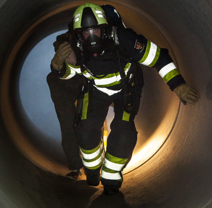 Sergeant-1 Pim van Straalen, instructeur ondersteuning search peloton, is trots op de gespecialiseerde trainingslocatie. “Een buizenstelsel van 3 verdiepingen, met daarin een hoogteverschil van 8 meter. De betonnen buizen variëren in diameter; in sommige kun je rechtop staan, door andere kun je alleen kruipen. Het geheel is opgezet om het werken in kleine ruimtes, wat wij noemen ‘working in confined spaces’ te beoefenen. Het stelsel is verder voorzien van een op afstand bedienbaar ventilatiesysteem en verlichting die je per compartiment kunt aan- of uitschakelen. Kortom: de ideale omstandigheden om onze search teams, maar ook bijvoorbeeld civiele hulpdiensten in de praktijk te trainen.”