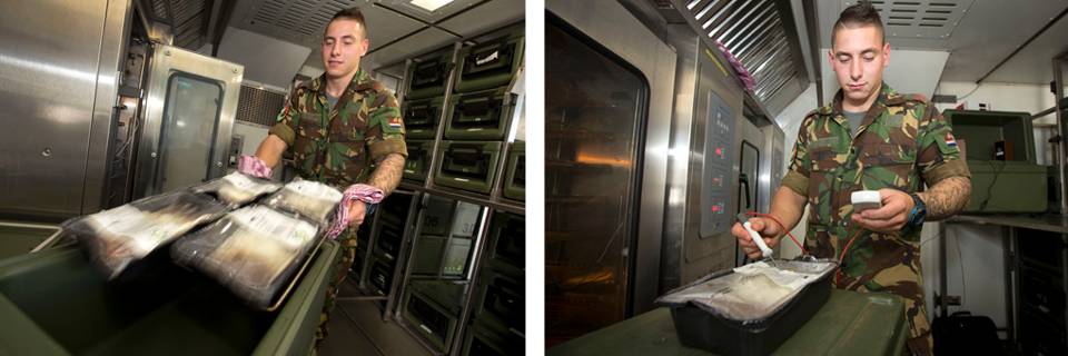 De luchtmacht geeft haar behoefte aan bij Paresto, die de (grotendeels) kant-en-klare maaltijden bij een bedrijf in Lelystad bestelt. “De klant kan kiezen”, zegt sergeant Roy, commandant distributiegroep 240 Dienstencompagnie. “Lokaal, MSK single portion, MSK multi portion of supreme. In single portion zitten alle componenten voor 1 persoon, in multi zijn de componenten apart van elkaar bereid. We streven ernaar zoveel mogelijk deze laatste categorie te gebruiken, maar dat kan niet altijd. In het bos kan ik moeilijk zeggen: ‘ik ga de tafel even mooi opdekken met verschillende producten en een saladebar’. Daar heb je 5 man personeel voor nodig. De KLu koos voor MSK single portion, dus wij zijn met z’n drieën.”