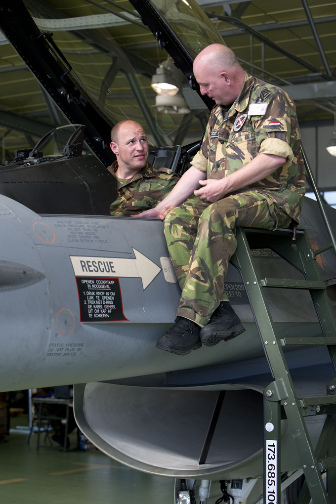 De kans om een F-16 van dichtbij te bekijken en er zelfs in te zitten, krijg je niet dagelijks. Sergeant Roy krijgt uitleg van crewchief sergeant-1 Robbie van het 312 Squadron.