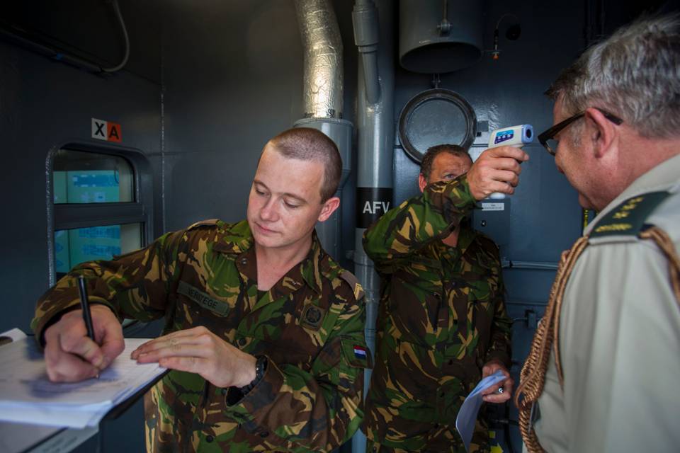 Sergeant-1 Jacques Verstege noteert de temperatuur van iedereen die in Monrovia aan boord komt.