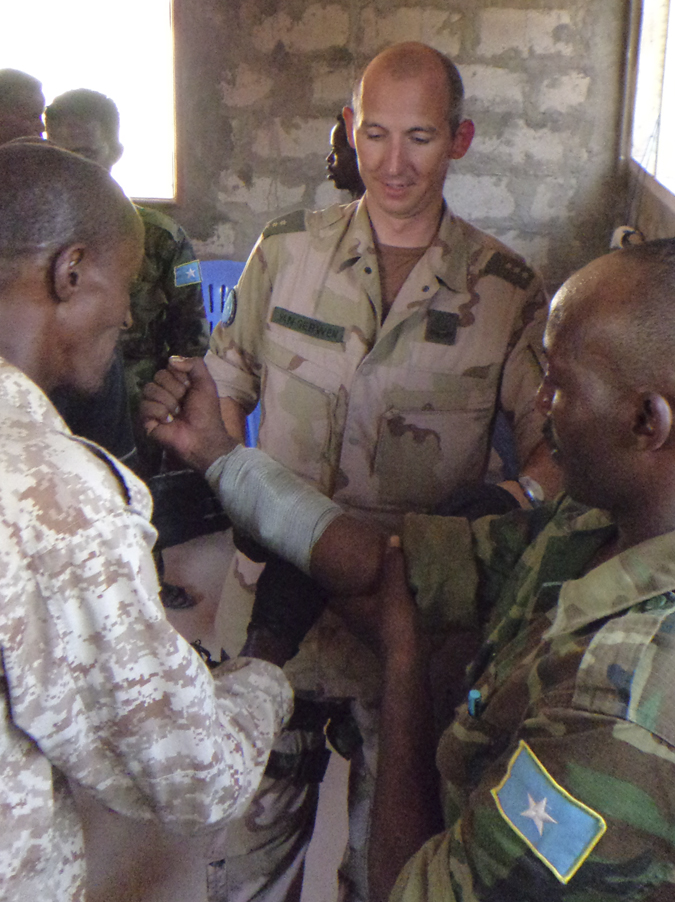 “De dagen beginnen met een rit in de ‘mamba’s’ (grote gepantserde voertuigen, red.). Voor onze veiligheid begeleidt een Italiaanse en Oegandese crew ons ‘konvooi’. De korte afstand tussen de basis bij het vliegveld en het Jazeera Training Centre (JTC) van het Somalische Nationale Leger leggen we behoedzaam af. Amper een week geleden ontplofte hier nog een autobom, vlakbij de toegangspoort naar het vliegveld. Iedereen is alert, maar de sfeer in het voertuig blijft ontspannen. Eenmaal aangekomen, druppelen de 11 cursisten binnen. Ze zijn gekleed in uniform, alleen de schoenen variëren van kisten tot sandalen en sloffen. Na zich stram in de houding te hebben gemeld, kan de les beginnen.