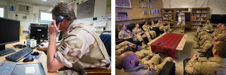 Links: Majoor Gert achter zijn bureau op het regionale hoofdkwartier in Mazar. Rechts: Adviseurs komen samen tijdens een wekelijkse briefing.