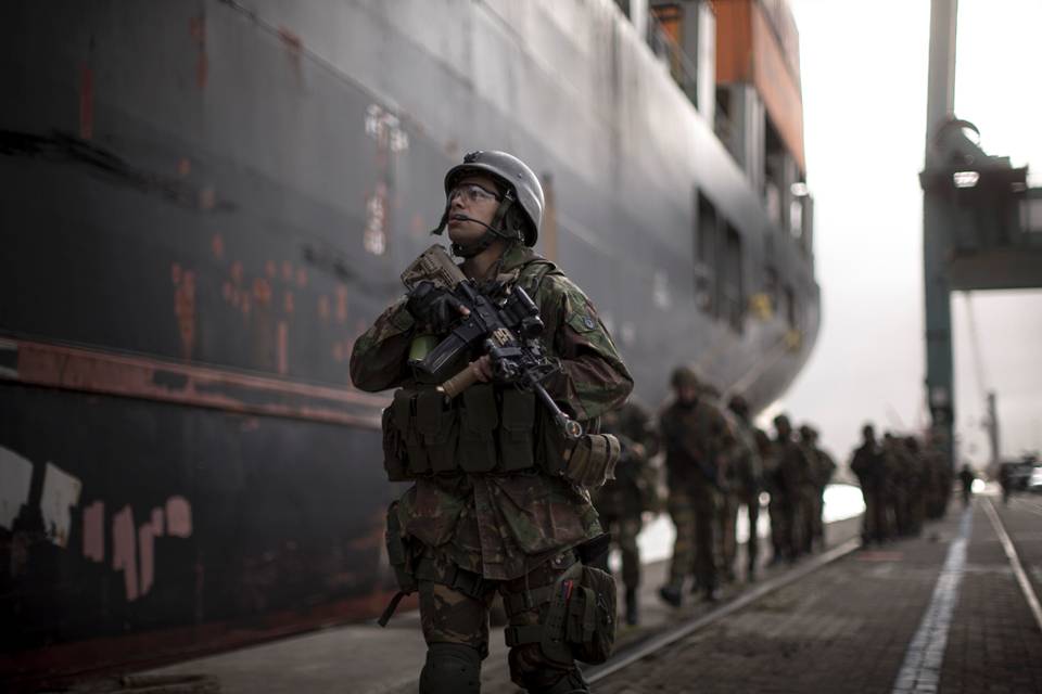 De loopbrug hangt nog maar net op de kade als het ontvangstcomité aan komt rijden. Tientallen militaire voertuigen stellen zich op voor het schip, waarna gewapende Nederlandse en Belgische genisten uitstappen.