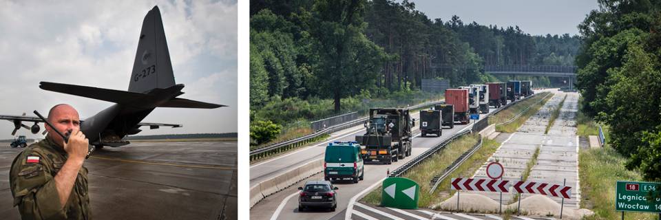 Links: Op het vliegveld werken Nederlandse militairen nauw samen met de Polen om mensen en middelen zo snel mogelijk in het oefengebied te krijgen.