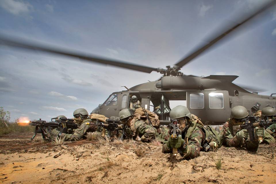 Amerikaanse Blackhawks hebben een peloton rode baretten afgezet. De luchtmobielers openen meteen het vuur.