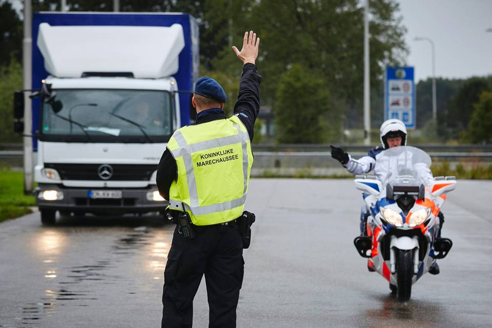 Tijdens een controle bij de Duits-Nederlandse grensovergang bij Babberich halen motorrijders steekproefsgewijs vrachtwagens en bestelbusjes van de weg.