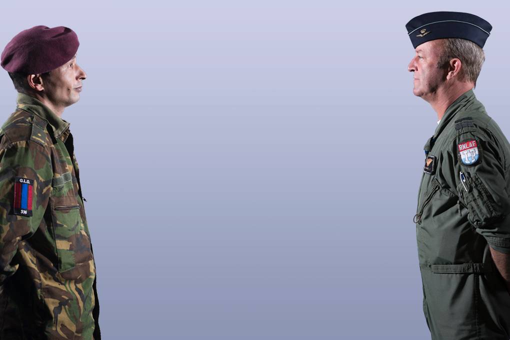 Het operationele huwelijk tussen eenheden van de landmacht en de luchtmacht is de laatste jaren naar een hoger niveau getild. Vrij letterlijk, want behalve transport- en gevechtshelikopters zet 11 Air Manoeuvre Brigade nu ook tactische transportvliegtuigen in. Airdrops en air landings vergroten de inzetmogelijkheden van de luchtmobiele infanterie. Maar met een verbeterde doctrine alleen ben je er niet. De 2 bloedgroepen binnen de luchtmobiele familie succesvol laten samenwerken, dat is vooral mensenwerk. Spil daarin zijn de liaisons van beide krijgsmachtdelen. Majoors (links) Igor de Fretes (oud-pathfinder en ground liaison officier bij 336 Squadron) en (rechts) Gert-Jan Bommeljé (Chinook-vlieger en air liaison officier transport helikopters bij 11 Luchtmobiele Brigade) vertellen over het verbreed operationeel concept van 11 AMB.