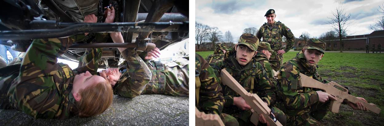 In een patrouille met leerlingen loopt Middendorp de verschillende VeVa-opleidingen van Landstede af. Bij Bedrijfsautotechniek moet hij snel een storing aan een terreinvoertuig verhelpen én een band verwisselen. Maar hij moet zich ook aan het strakke schema houden, weet Ralph Bultman. “Kom op generaal, we moeten door”, spoort de groepscommandant-voor-een-dag ’s lands hoogste militair aan. Na de monteurs-in-spé moet de CDS zich immers ook nog laten bijpraten door de leerlingen in de richting zorg. Zij vormen de militaire verzorgenden en verpleegkundigen van de toekomst.
