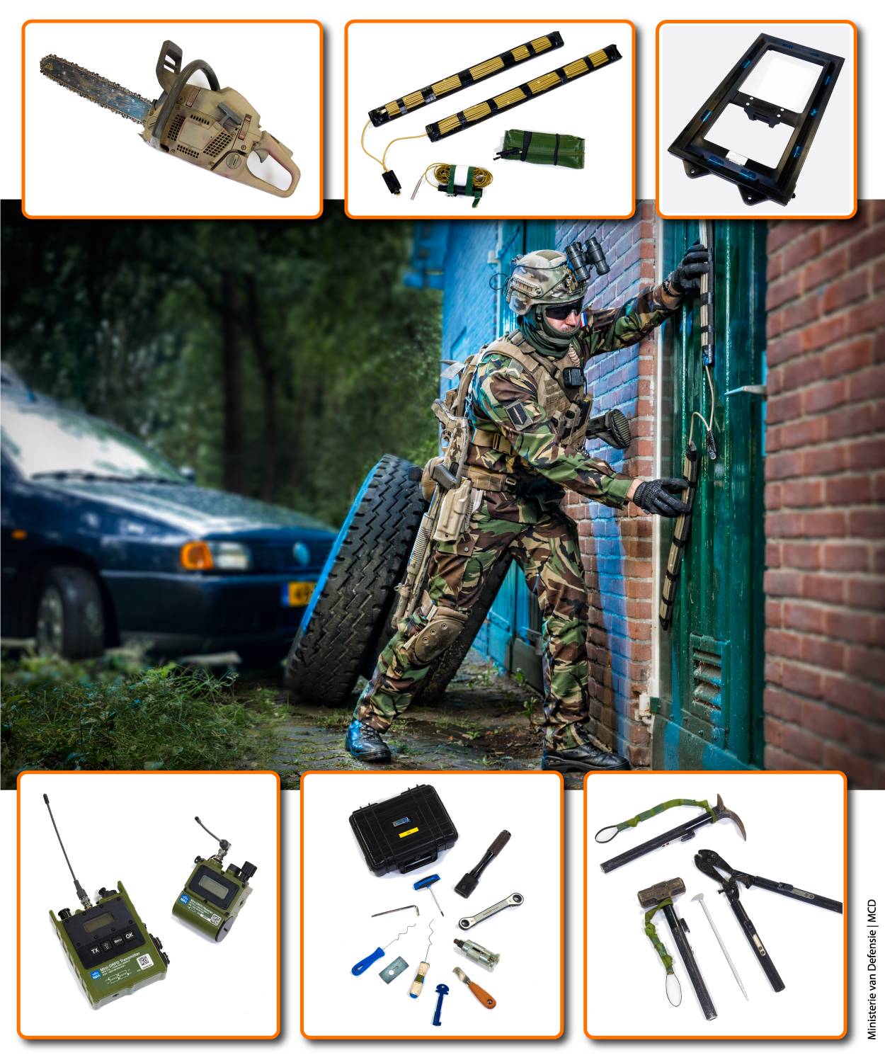 Met een kleine moker kunnen deuren en ramen worden geslecht. Een welgemikte klap kan wonderen doen. De betonschaar is geschikt om allerlei soorten draad door te knippen, denk bijvoorbeeld aan ijzerdraad in de gewapende betonmuur. Een hangslot is kinderspel voor het breekijzer. Het vierde stuk gereedschap is de Halligan tool, vernoemd naar de uitvinder, een Amerikaanse brandweerman. Met de punt kunnen ramen aan diggelen worden geslagen, het op een schoenlepel lijkende gedeelte is bedoeld om naar buiten openslaande deuren te kraken.