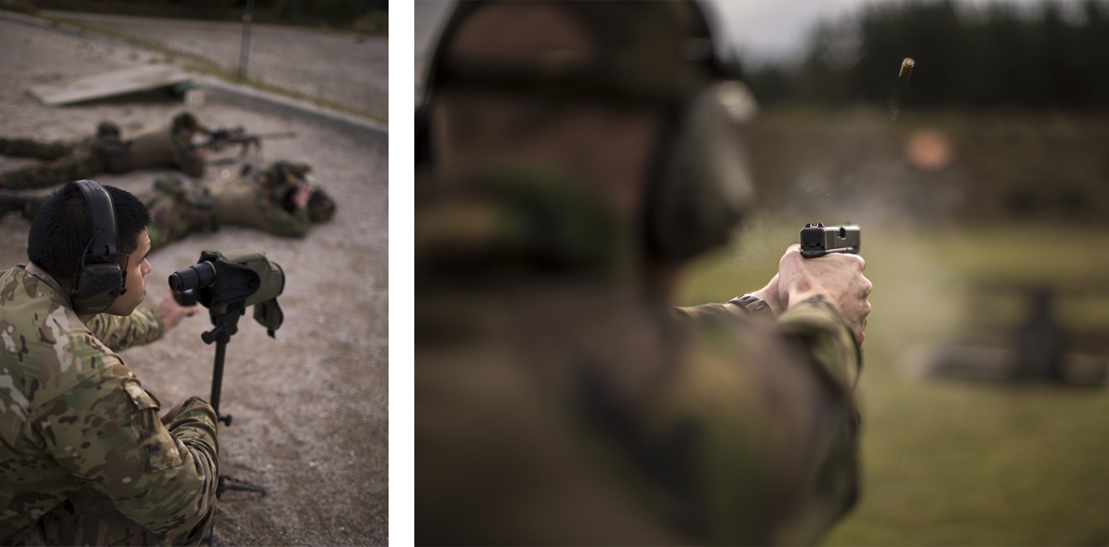 Links: De organisatie van de wedstrijd komt grotendeels voor rekening van de onder-officiersgemeenschap op Kamp Grafenwöhr. Rechts: Bij het onderdeel advanced pistolshoot moeten de deelnemers onder tijdsdruk diverse oefeningen met hun persoonlijk handvuurwapen schieten.