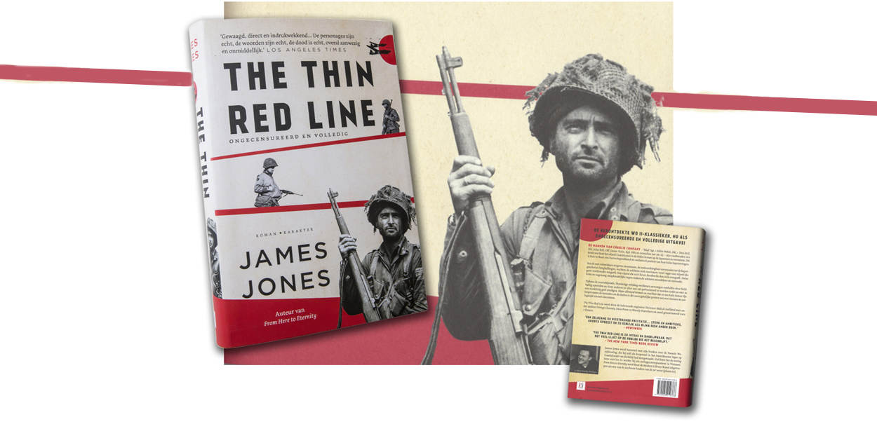 Jones maakte als korporaal in het Amerikaanse leger de strijd zelf mee. Als geen ander weet hij het gevoel van op leven en dood vechtende soldaten op een indrukwekkende manier op papier te zetten. Niet iedereen is een held. Waar de één medailles verdient door heldhaftig optreden in de meest uitdagende situaties, blijkt de ander ongeschikt voor de missie in de Stille Oceaan. Dat de bekroonde regisseur Terrence Malick The Thin Red Line uitkoos om te verfilmen, mag geen verrassing heten. De haast ondraaglijke spanning bij zowel de Amerikanen als de Japanners is voelbaar in dit meeslepende boek.