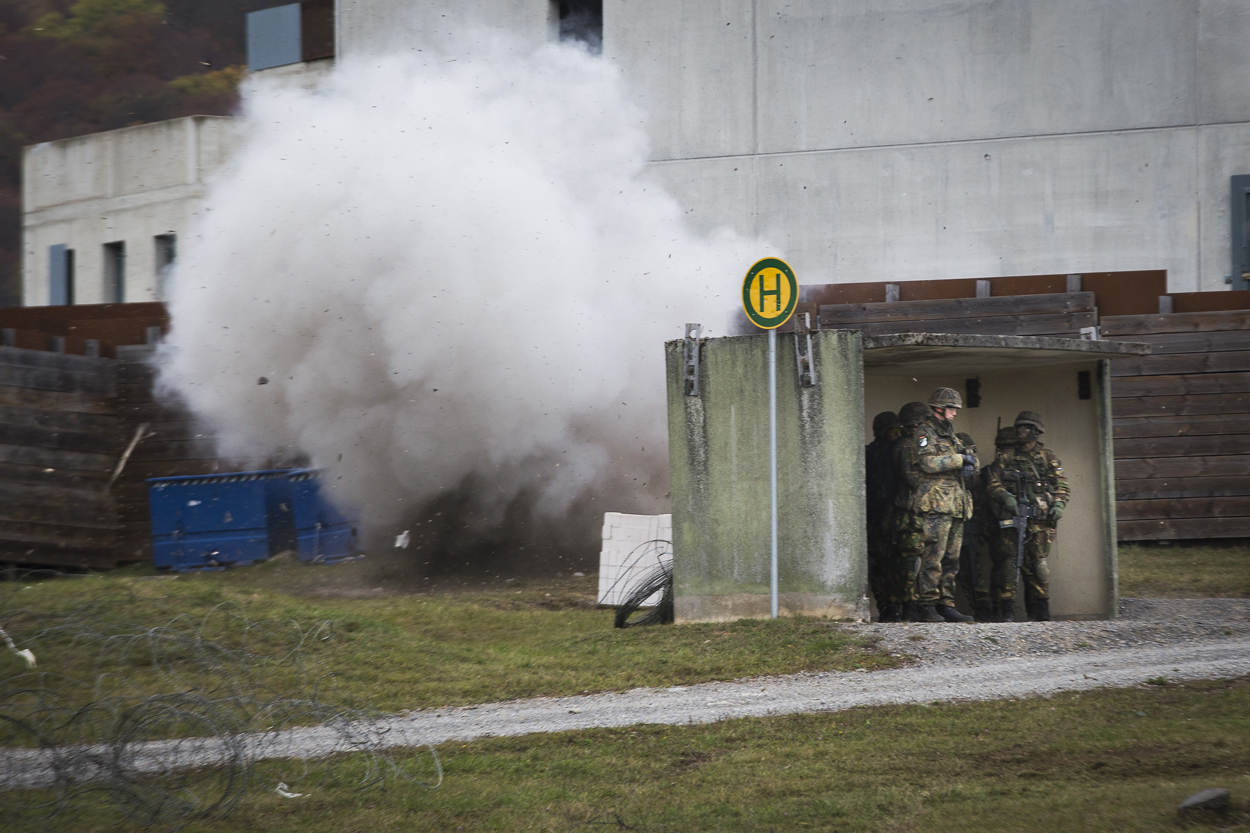 De infanteristen en genisten vechten zich 3 uur lang van huis naar huis. Metalen schietschijven springen voor en rond de mannen op. “Je bent als een bokser”, schetst Hauptfeldwebel Sebastian Kaiser, een van de vele veiligheidsofficieren op de schietbaan. “Je moet voortdurend in beweging zijn. Sta je stil, dan ga je neer.”