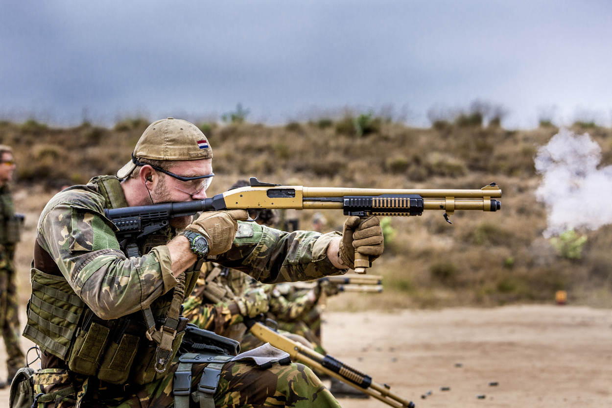^ In het CD&E-traject Ranger neemt een militair van 12 Infanteriebataljon een doel te grazen met een shotgun.