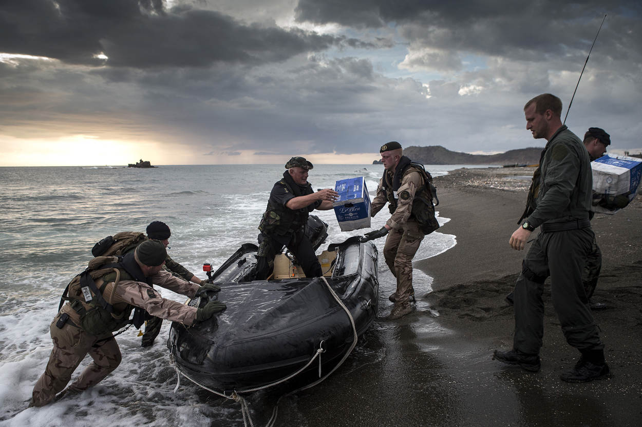 ^ Genisten die deel uitmaken van de Compagnie in de West helpen in Haïti kort na de verwoestende orkaan Matthew mee met het aan land brengen van hulpgoederen.