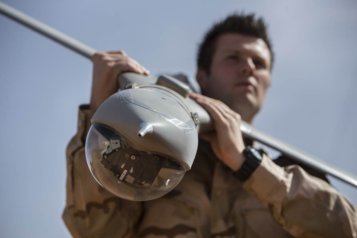 ^ Nadat de ScanEagle ongezien en ongehoord een missie boven Mali heeft uitgevoerd, brengt een militair van het JISTARC de ‘elektronische adelaar’ weer naar het nest.