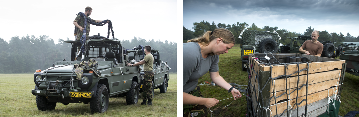 Op de heide bereidt de mortiergroep het materieel zorgvuldig voor op vertrek. Rigger Marshallers zijn druk in de weer met touwen, tape en kettingen. Ze binden de 120 mm-brisantgranaten vakkundig vast in pallets, zodat die straks veilig onder de Chinooks hangen. De LPC checkt of alle kettingen correct klaarliggen. “Ik wil zeker weten dat de sling nergens tussen schiet en alles krom trekt”, inspecteert hij nauwkeurig.