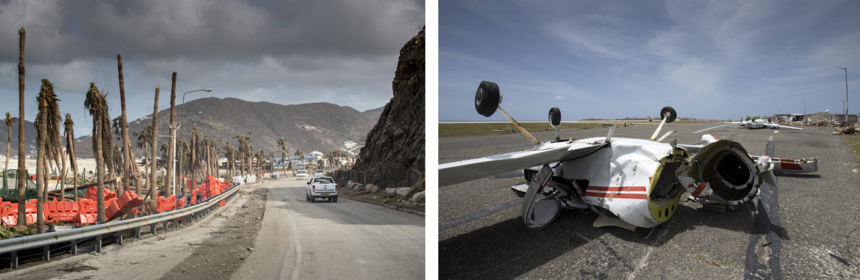 Palmbomen hangen treurig in de berm, vliegtuigjes liggen aan stukken. In nog geen 4 uur tijd maakte Irma van Sint-Maarten een spookeiland.
